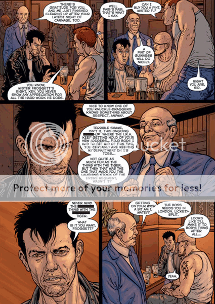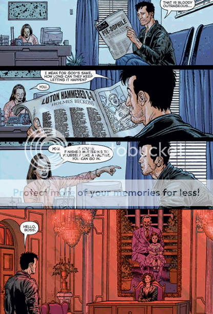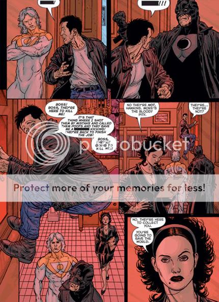 Wildstorm put the interior pages up in .pdf format, which can be accessed here. If you'd just as soon not be hassled, and/or don't care that I had to trim down the edges a little tp get the images to fit on photobucket without losing speech-balloon legibility, here are the individual images: