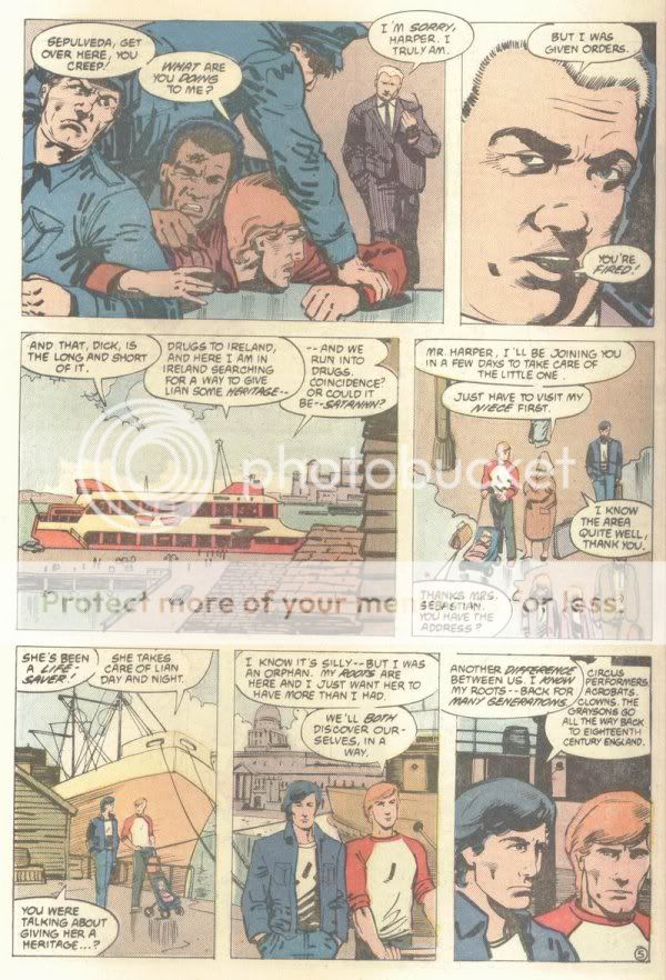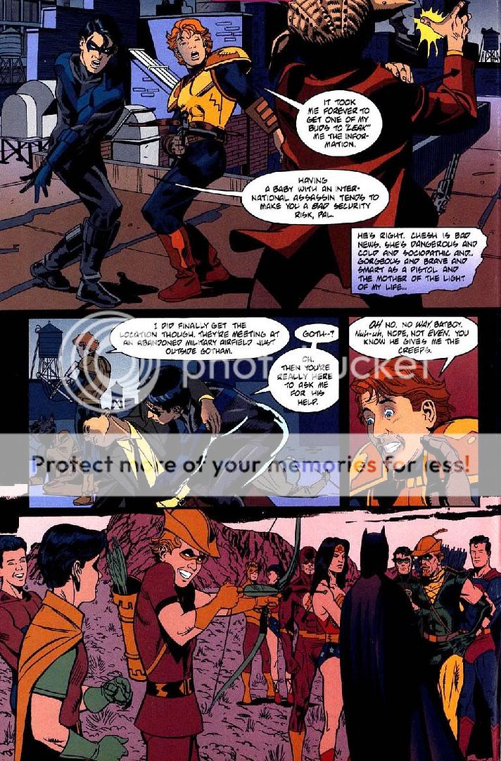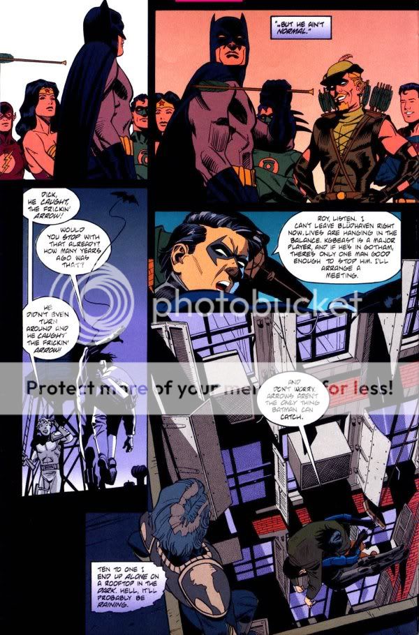 a) As I said, the story opens on Dick, in Blüdhaven, kicking ass. Roy turns up and they converse while Dick continues kicking ass. (Mmm, multitasking.) A bit of dialogue: Roy says, "I need to talk to you, buddy. It's... kinda important." Dick, on the ground wrestling with one of his perps (and having the upper hand despite being on his back under the guy) responds, "Shoot." Roy fires a crossbow bolt through the perp's knife hand. "Roy!" Dick chides, "I meant tell me what's going on!"There are, of course, many more choice panels, situations and conversations, and a truly priceless founding-Teen-Titans flashback -- this isn't like a coming attractions trailer that consists entirely of the five good jokes in the whole film.